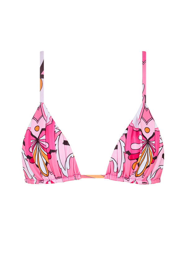 The Era Ruched Triangle Top by Australian swim designer Cin Cin is a classic adjustable triangle top with feminine gathering front panels. This top selling style features adjustable shoulder straps and a string tied back. Offered in the Boheme Pink print.