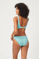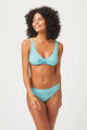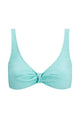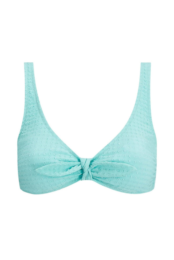 The Great Thatch Bow Scoop Top by London swim designer Heidi Klein offers a touch of femininity in a medium support style. This flattering bikini top features non-adjustable straps, removable pads and a clasp back. Offered in a tonal turquoise seersucker.