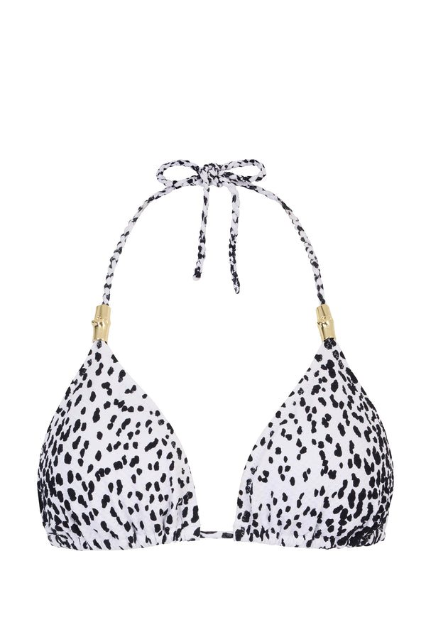 The Icaria Triangle Top by Heidi Klein is your new go-to for effortless beach days. With just the right amount of coverage and a touch of extra support, it keeps you comfortable while turning heads. Adjustable rope neckties let you customize the fit, and removable padding lets you choose your vibe. Finished with charming gold bamboo hardware, this classic bikini top adds a playful touch to your swimwear collection.