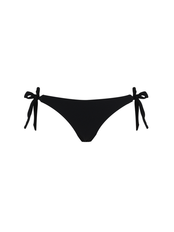The Iguacu bottom by Bromelia is a fuller coverage bottom with thicker side ties and flattering ruching in the back. Offered here in black ribbed fabric