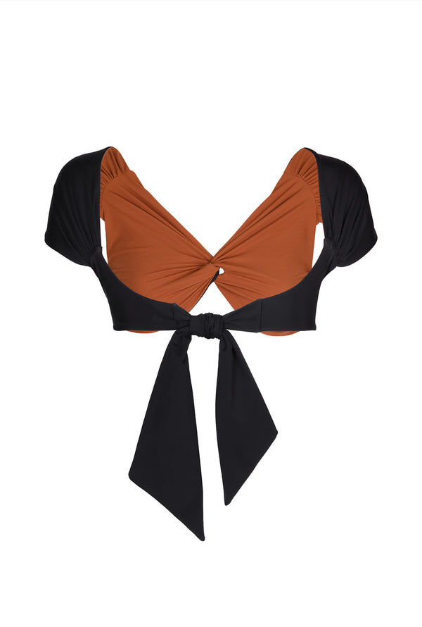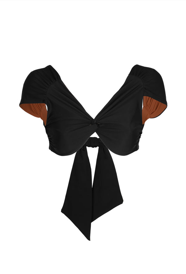 Introducing the Niche Top designed by Colombian swimwear designer Juan De Dios. This reversible bikini top features adjustable ties in the back for a perfect fit and charming cap sleeves with a sweetheart neckline. Upgrade your beach look with this stylish and versatile piece. Offered in black with Argan reversible color.