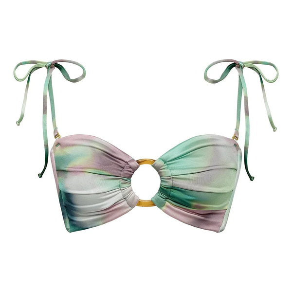 Add a touch of fun to your swimwear collection with the Tori Ties Bandeau Bikini Top inย Silk Dye! This strapless top offers medium support and features side-seam boning for added stability. The adjustable self-tie back closure ensures maximum comfort while the ruched detailing and removable tie-up straps add style and support.ย