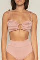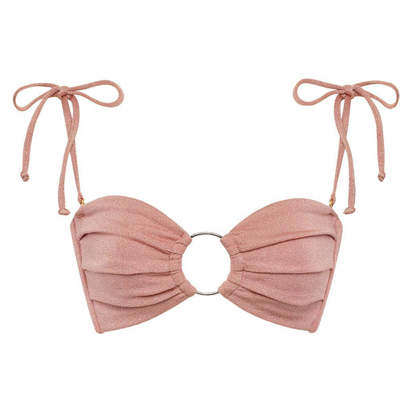 The Tori Ties Bandeau Top in Prima Pink Sparkle by Montce offers a convertible style with ample support as a bandeau. The removable tie shoulder straps are delicate but functional while the side boning allows for strapless security. Fabric gathers to center at ring. The wide back tie assists with the perfect fit.