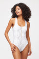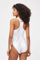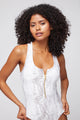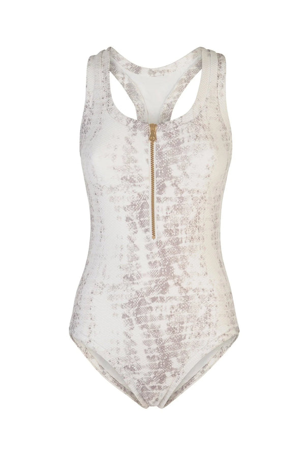 Meet the Racerback One Piece Swimsuit by Heidi Klein. Available in a bold snake print. This sporty and stylish suit features a signature chunky gold zip and hidden shelf-bra for enhanced support. It's the perfect choice for effortlessly chic poolside or beach days.