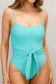 The Lina Tie One Piece in Seafoam and Amanda Talley Print by Ophelia Love is the classy and sleek suit you want! This one-piece features adjustable straps, a shelf bra, and a front tie to accentuate the waist.