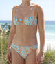 Introducing the Traveler's Bottom by Ophelia Love. A hipster bottom with a playful twist that featuring charming ruching on the front to elongate the legs. This bottom offers full to moderate coverage for a comfortable and flattering fit. Pair it with the fun and cutesy Marcela Underwire Top for a delightful beach look that exudes charm and style. Offered in Ophelia's signature Seaside Palm print.