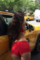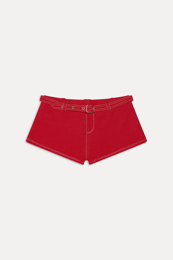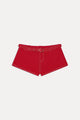 Add a splash of western flair to your summer look with the Wrangler Denim Booty Shorts in vibrant red by Frankies Bikinis. Crafted from soft denim swim fabric, these cheeky shorts offer medium back coverage and high support for all-day comfort. Featuring contrast stitching, back pockets, and a unique belt detail with loops, they’re perfect for layering over your favorite bikini or rocking solo.