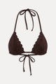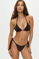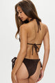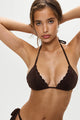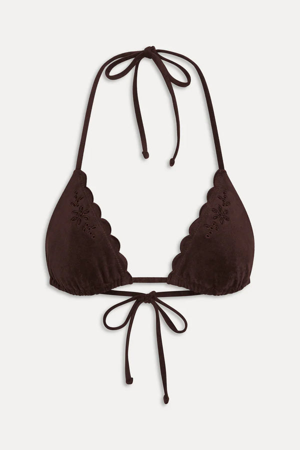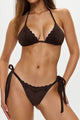 Make a splash in the Nick Suede Triangle Bikini Top by Frankies Bikinis, where desert-inspired style meets water-ready performance. This playful halter features delicate floral embroidery adorning waterproof suede fabric that's as chic poolside as it is in the ocean. The skimpy triangle cut offers minimal coverage for maximum confidence, while adjustable ties at the neck and back ensure a custom fit.