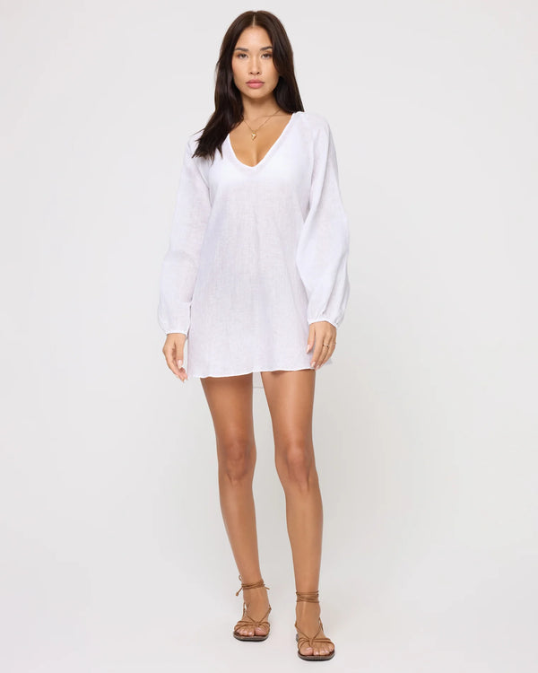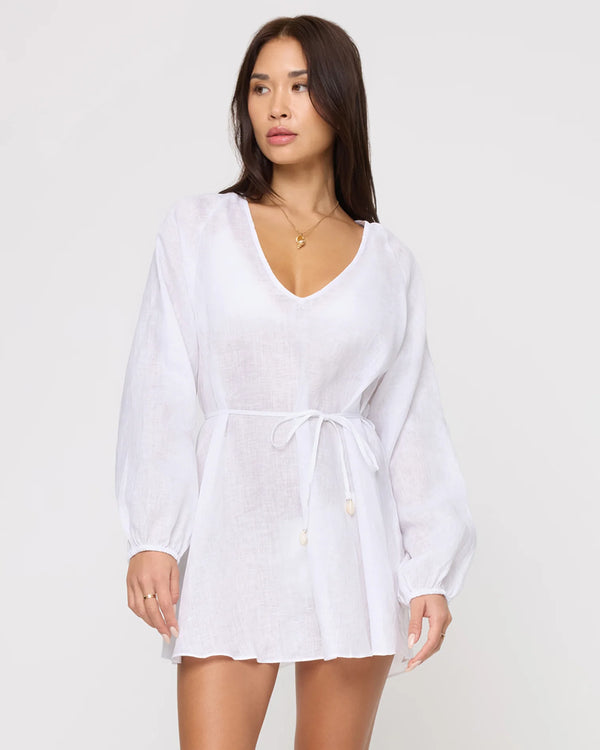 Set sail in the Boat Trip Tunic in White by LSpace, a playful blend of mini dress and cover-up perfect for sunny days. Featuring voluminous long sleeves with elastic cuffs and a deep V neck, it offers breezy comfort with a touch of flair. The waist ties, adorned with charming shell details, can be styled as a belt or tied at the back to accentuate your silhouette. Effortless and flirty, this tunic is your go-to for seaside adventures or poolside lounging.