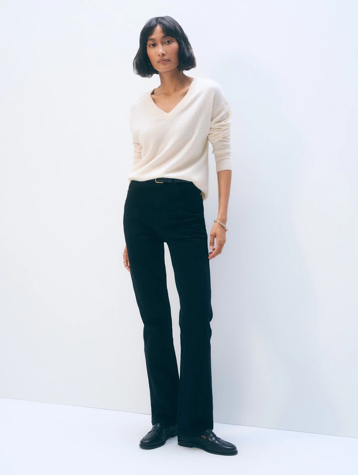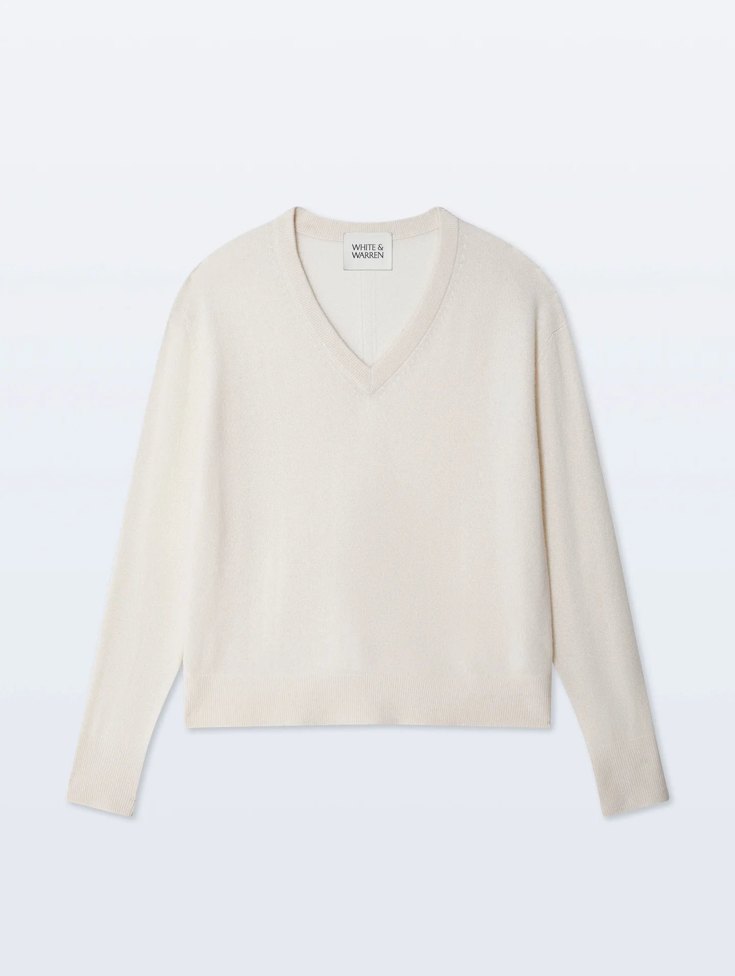 Your new go-to sweater by White and Warren in soft white. Made from 100% cashmere with a flattering V neckline, ribbed trim, and center-back detail. Relaxed fit with a longer length—size down for a slimmer silhouette. Effortlessly chic and endlessly wearable.