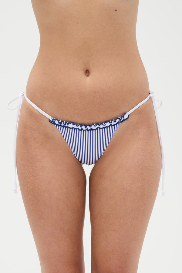 Introducing Frankies Bikinis Divine Skimpy Bikini Bottom - your new beach essential. With its low-rise fit and skimpy coverage, it's the perfect balance of flirty and functional. The adjustable tie sides and ruffle trim add a touch of playfulness to your seaside style. Dive in and make waves with the new nautical striped print.