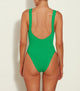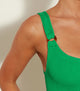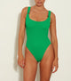 The Domino One Piece swimsuit by Hunza G is offered in their popular crinkle fabric in a one size fits most style. This vibrant Emerald color is accented by the tortoise shell detailing along the shoulder straps.