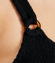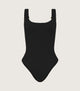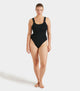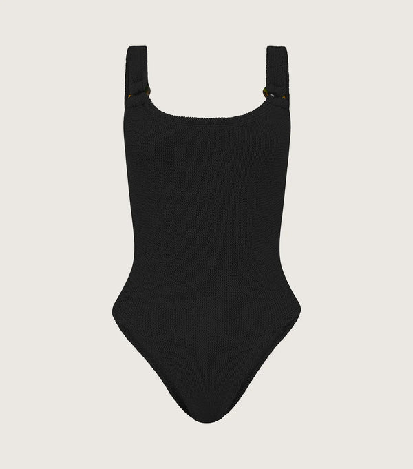 Dive into style with the Domino Swim one piece in black by Hunza G, featuring tortoiseshell accents and a unique dipped neck silhouette. With a low scooped back and classic coverage, it's the perfect fit for all sizes. Make a splash with this trendy and playful swimsuit!