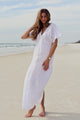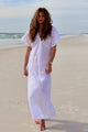100% Linen coverup by Ophelia's private label features a faux knot in front, v neckline, kimono sleeves, and a small slit in the back. Effortless and sophisticated beach style! Offered here in white.