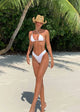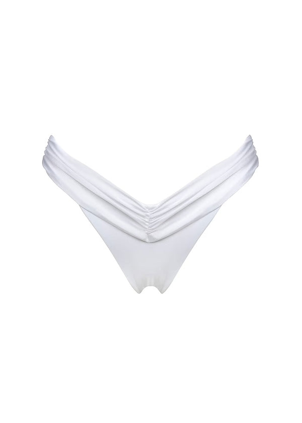 Get ready to turn heads at the beach with Jasmin Bottom by Bananhot! The ruching design creates a flattering 'V' shape that elongates your legs and enhances your shape. Made with a sheen finish, these bikini bottoms add a touch of glam to your swimwear. Flirty and stylish, they're a must-have for your next vacation. Offered in white.