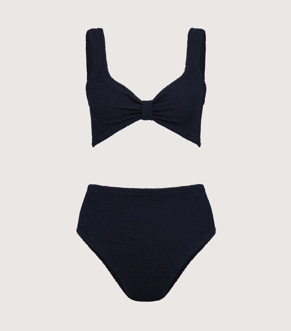 Meet Judy, your new go-to bikini by Hunza G! With a gathered bow detail and high-waisted bottoms, she provides support in all the right places. Soak up the sun in style and comfort with this classic black bikini.