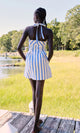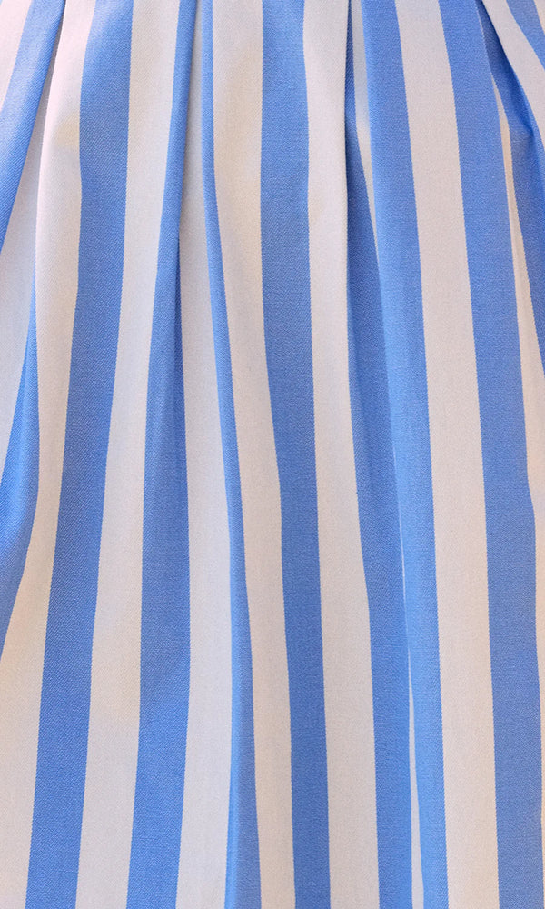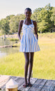 The Kate Dress in blue and creme stripes by Saylor combines timeless seaside charm with thoughtful design. A flattering halter neckline and pleated bodice create beautiful dimension and visual interest. Crisp stripes evoke coastal elegance, while hidden side pockets deliver practical style without compromising the silhouette. Perfect for beach days, casual outings, or any occasion calling for effortless sophistication.