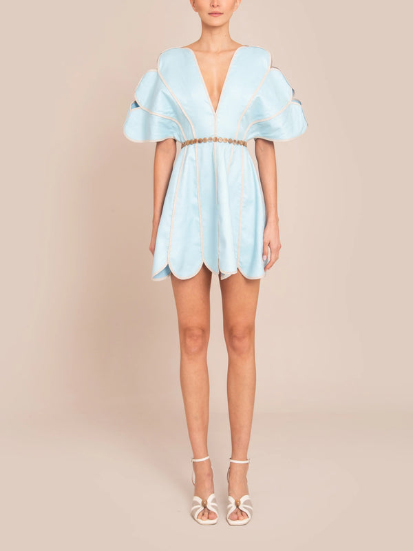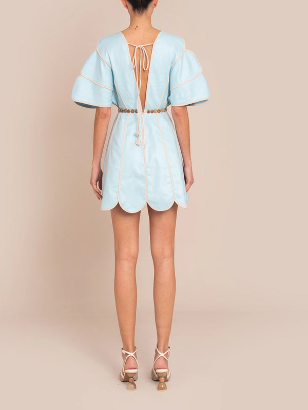 Unleash the bold beauty of Namika Dress Acqua by Colombian designer Azulu. This one of a kind dress is crafted from 100% linen for a structured yet breathable silhouette. Its sculptural V-neckline creates delicate cutouts along the sleeves and hem for an architectural look. The open back and tagua appliqués cinch the waist for a touch of contemporary charm. Perfect for any occasion.