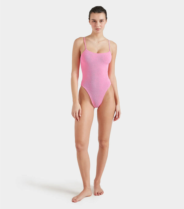 Keep it classic with the Pamela Swim in Bubblegum by Hunza G. Featuring delicate straps, a scooped neckline, and adjustable coverage, this minimal one-piece is designed for carefree days in the sun. Made from Hunza Gās signature crinkle fabric, it offers a one-size-fits-most fit, light bust support, and classic bottom coverage.