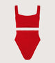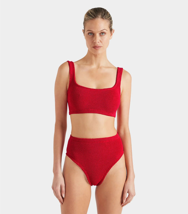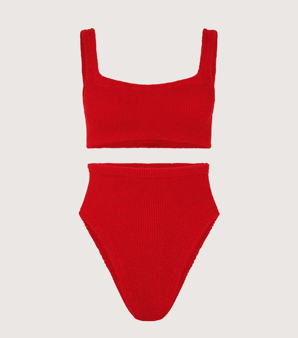 Unleash your inner beach babe with the Patricia Bikini in Red by Hunza G. The square neckline and high-waisted bottoms make for a stylish and hassle-free look.