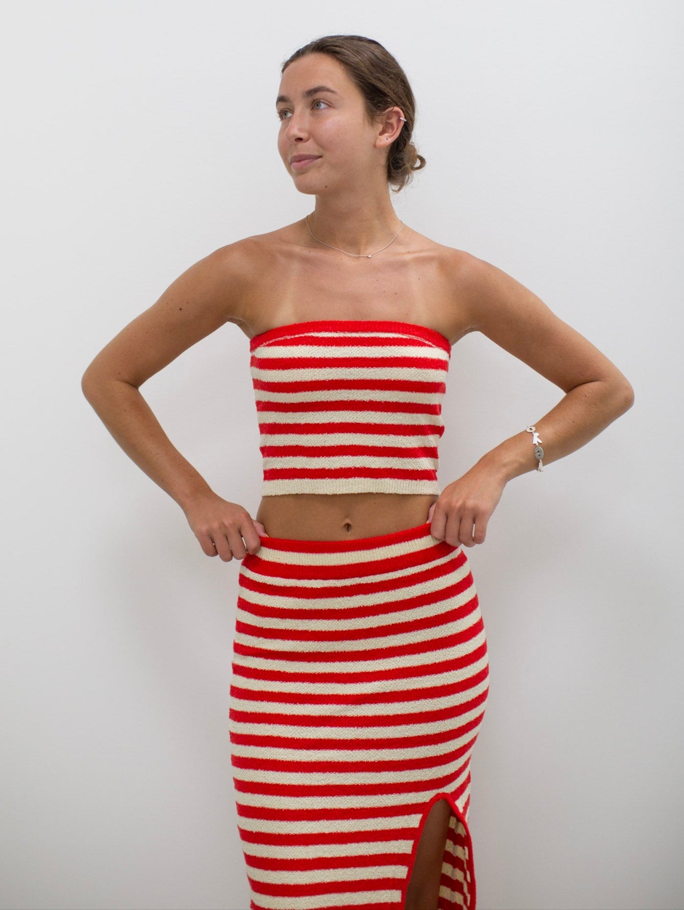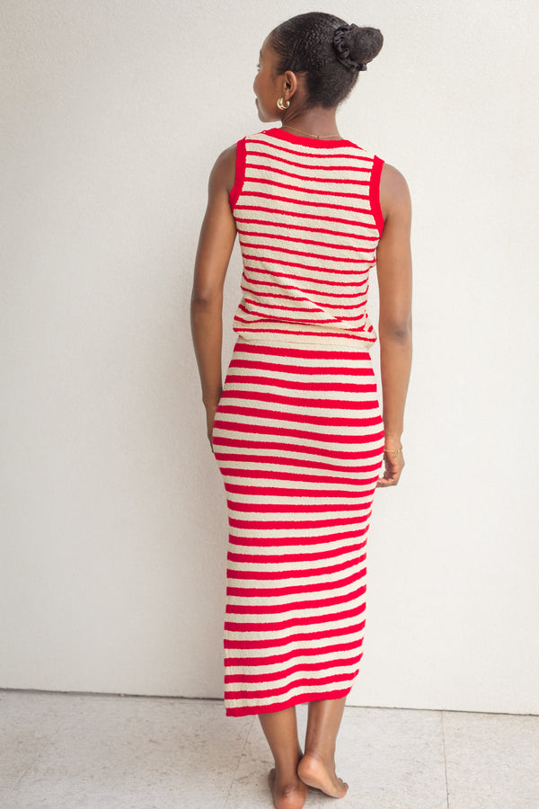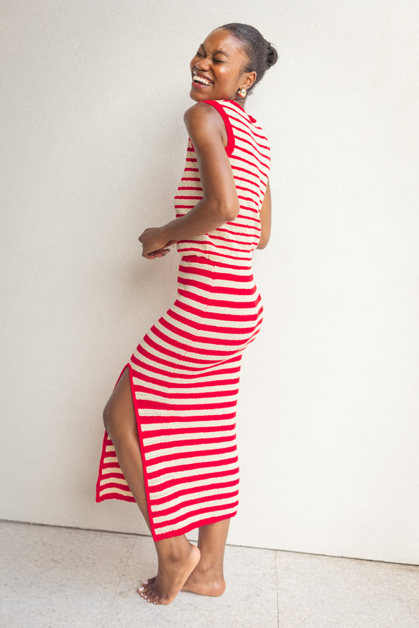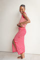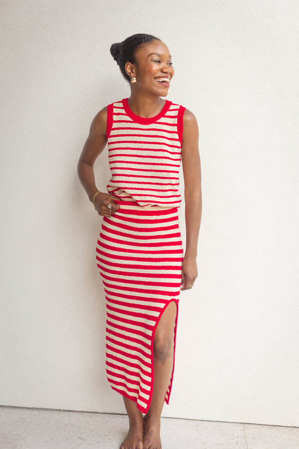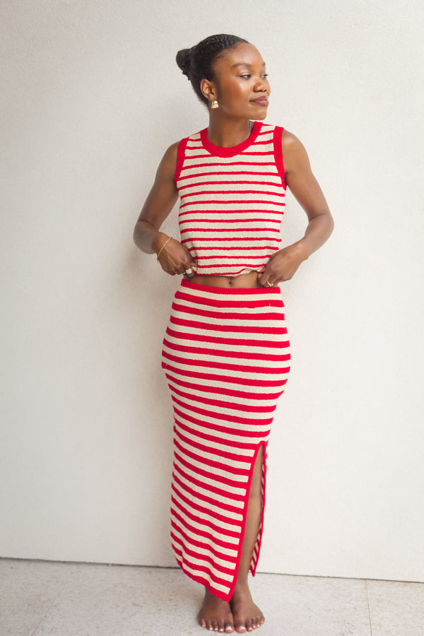 The Red Flag Maxi Skirt from Ophelia Love brings a splash of fun with its vibrant red and white stripes. Crafted from stretchy terry fabric, it offers comfort and ease of movement. The stretchy waistband ensures a perfect fit, while the playful leg slit adds a flirty touch to your look. Perfect for sunny days and breezy evenings, this skirt combines style and comfort effortlessly.