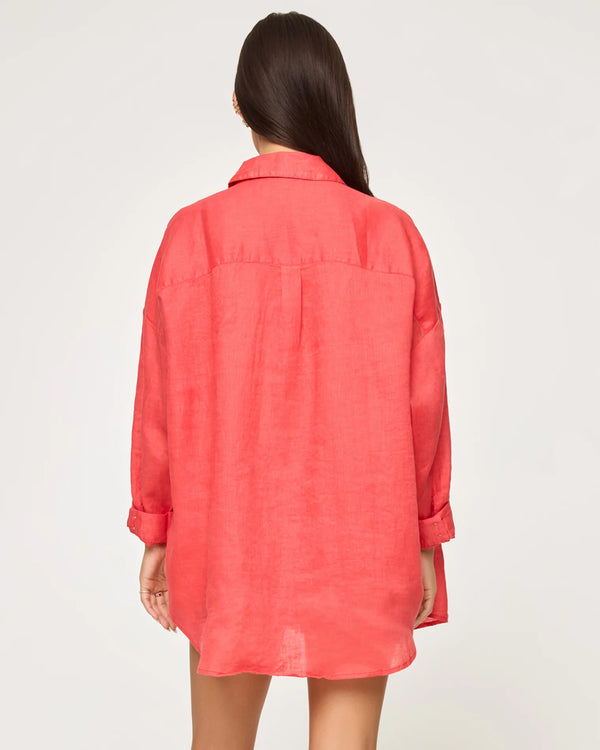 Introducing the Rio Tunic in vibrant Grapefruit by LSpace! This playful button down collared shirt features cuffs with buttons and an oversized, relaxed fit. Perfect for adding a pop of color to any outfit!